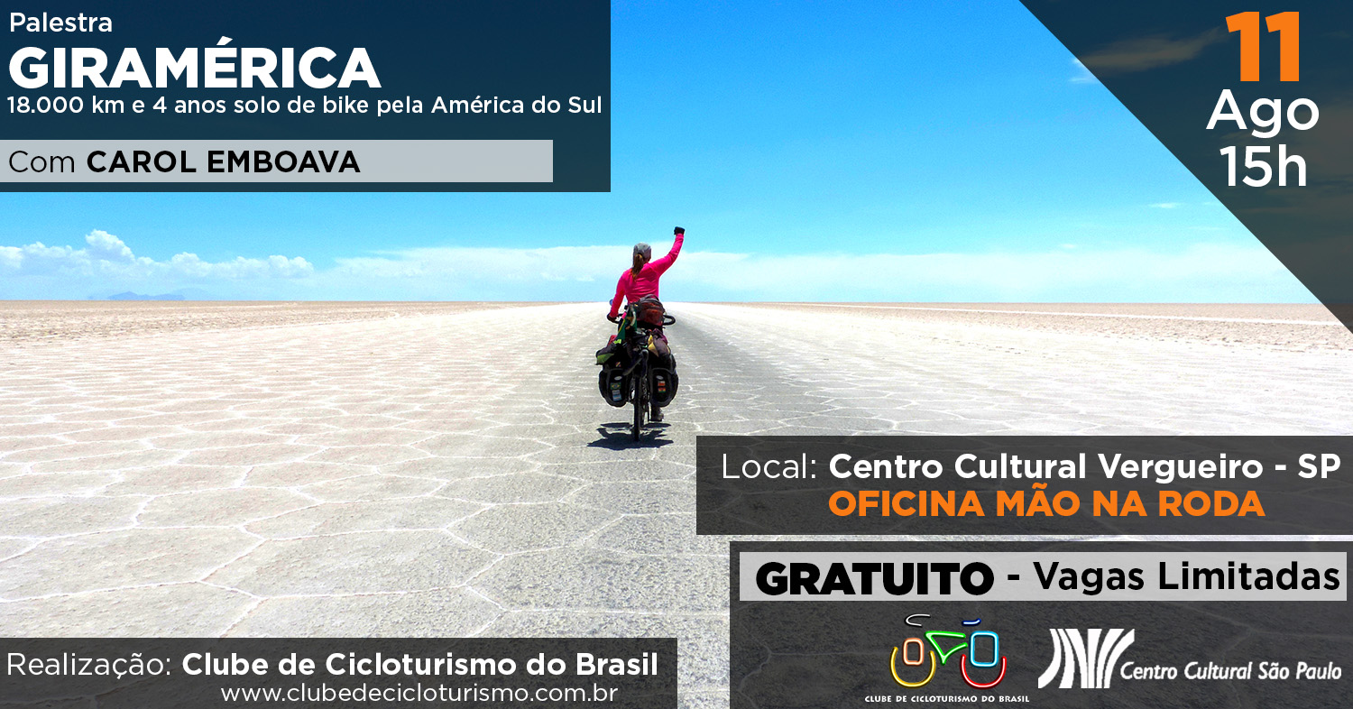 Esta atividade faz parte do ciclo de palestras e encontros mensais do Clube de Cicloturismo do Brasil no Centro Cultural São Paulo - Vergueiro (CCSP) em parceria com a Oficina Mão na Roda, sempre no segundo sábado do mês.